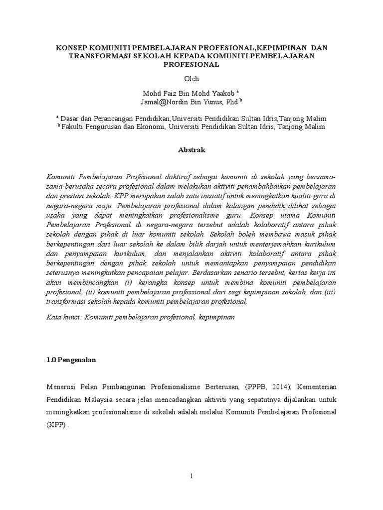 Inisiatif ini dipilih bagi tujuan pemantapan pembelajaran profesional dikalangan pendidik. Kajian Terhadap Sekolah Menengah Di Malaysia Creating a Professional Learning Community. JURNAL KEPIMPINAN PENDIDIKAN KOMUNITI PEMBELAJARAN PROFESIONAL GURU BAHASA MELAYU MALAYSIA Siti Nafsiah Ismail Zuraidah Abdullah Abdul Jalil Othman Fakulti Pendidikan Universiti Malaya nafsiahismailipgmedumy ABSTRACT This study is aimed at identifying the level of Professional Learning Community of Malaysian Malay Language teachers.